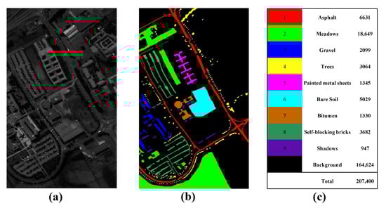 (2) Pavia University (PU): The second dataset was a part of the hyperspectral image data of the Pavia city in Italy, photographed by the German airborne reflective optics spectral imaging system (Rosis-03) in 2003, containing 9 categories (see Figure 8). The resolution of this spectral imager is 1.3 m, including continuously 115 wavebands in the range of 0.43–0.86 m. Among these bands, 12 bands were eliminated due to the influence of noise. Therefore, the images with the remaining 103 spectral bands in size are normally used.