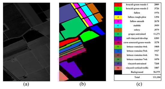(3) Salinas (SA): The third dataset recorded the image of Salinas Valley in California, USA, which was also captured by AVIRIS. Unlike the IP dataset, it has a spatial resolution of 3.7 m and consists of 224 bands. However, researchers generally utilize the image of 204 bands after excluding 20 bands affected by water reflection. Thus, the size of the Salinas is , and Figure 9 depicts the color composite of the image as well as the ground truth map.