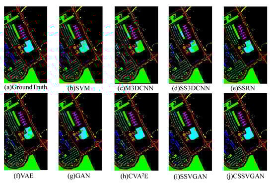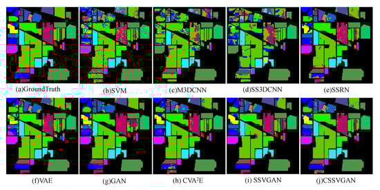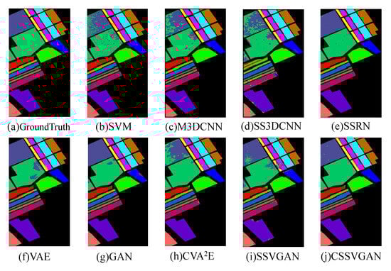 Table 11 shows that in the index of OA, AA and Kappa, CSSVGAN improved 0.57%, 1.27% and 0.62% at least compared with others. Moreover, it has a better performance in the “brocoli-green-weeds-1” and “stubble” class with a test accuracy of 100%. For the precisions of other classes, although SSRN, VAE or SSRN prevails, CSSVGAN is almost equal to them. It can be seen that CSSVGAN has smoother edges and the minimum misclassification in Figure 12, which further proves that the proposed CSSVGAN can generate more realistic virtual data according to the diversity of extracted features of samples.