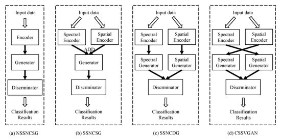 The frameworks of ablation experiments: (a) NSSNCSG (b) SSNCSG (c) SSNCDG (d) CSSVGAN.