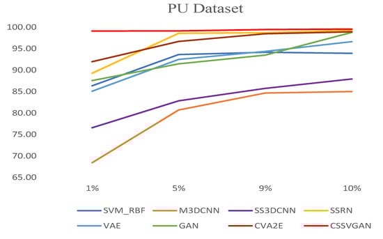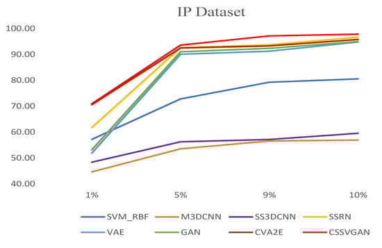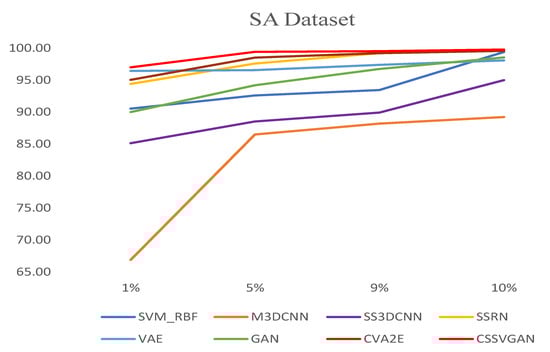 To verify the effectiveness of the proposed CSSVGAN, three datasets were taken as examples. The percentage of training samples was changed for each class from 1% to 9% at 4% intervals and added 10%. Figure 14, Figure 15 and Figure 16 shows the OAs of all the comparative algorithms with various percentages of training samples.