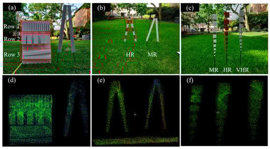Experimental tests for prototype development: (a) A barcode pattern with different length and spacing. Row 1 has spacing ranging from 1 mm to 25 mm, row 2 has spacing 30, 40 and 50 mm, and row 3 is a < shaped pattern. (b) A ∧ shaped pattern with highly reflective (HR) and moderately reflective material (MR), and (c) a square block with 30 mm spacing made of moderately (MR), highly (HR) and very highly reflective (VHR) material was placed in a well-lit environment. (d) Point cloud corresponding to figure (a), (e) point cloud corresponding to figure (b), and (f) point cloud corresponding to figure (c).
