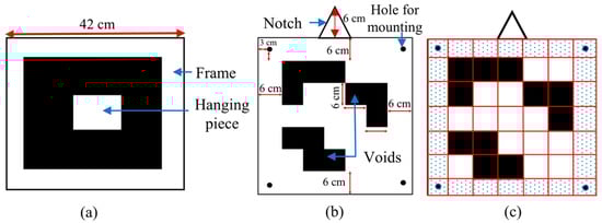 A 1.5 cm-thick opaque white acrylic panel was used for 3DUID construction, and the selected pattern was carved by laser cutting for the voids. Since the obtained minimum mappable unit was 3 cm from a scanning distance of 5 m, the size of each grid in 5 × 5 pattern was kept to 6 cm, accounting for uncertainties at an operational mine site (Figure 3a). Thus, the panel had a dimension of 42 cm × 42 cm including extra grids on the boundary for structural support (Figure 3a). An equilateral triangular notch of 6 cm was added at the apex for ease in surveying, automated georeferencing and coregistration process. Holes were drilled on the four corners to support the mounting mechanism. A prototype of the generated 3DUID patterns is shown in Figure 3b.