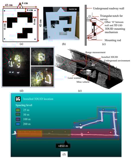 The study area was a section of an underground coal mine located in Southern Coalfields, New South Wales, Australia. The study area, approximately 850 m long, was selected to test the 3DUID in a range of challenging conditions such as unavailability of GNSS signals, intrinsic safety/fire-related hazards, limited to no lighting, repetitive geometry, lack of discriminative features, low surface reflectivity and dusty environment. The experimental conditions were ideal for testing the efficacy of 3DUID assisted and unassisted scan registrations. A total of thirteen unique 3DUID patterns were generated, constructed and installed against the wall at an offset distance of 10–15 cm to enable depth perception for pattern recognition at the mine site (Figure 3c). Each 3DUID tag was installed over the underground wired mesh support using tie-on metal wires hooked at four corners (Figure 3d). A laser scanner mounted on a mining vehicle performs an ordinary pass-by scan of the tunnel in areas with the installed 3DUID (Figure 3e). The accuracy of georeferencing and data coregistration depends on the number and distribution of 3DUID tags across the section of the tunnel. Increasing the number of installed 3DUIDs as GCTs is expected to increase both accuracy and cost. Therefore, a variably spaced strategic installation of 3DUIDs was adopted in this study to identify the optimal spacing in terms of both accuracy and cost-effectiveness (Figure 3f). Four discrete spacing levels were defined, i.e., 25 m, 50 m, 100 m and 200 m, such that for each spacing level a total of five 3DUID tags were available, this also facilitated leave-one-out cross validation. For georeferencing, a surveying exercise was undertaken where the notch on the top of each 3DUID tag was surveyed with a total station (Trimble M3, California, CA, USA). The coordinate system used was the map grid of Australia 1994 (MGA94) which is based on the geocentric datum of Australia 1994 (GDA) and the Australian height datum (AHD).