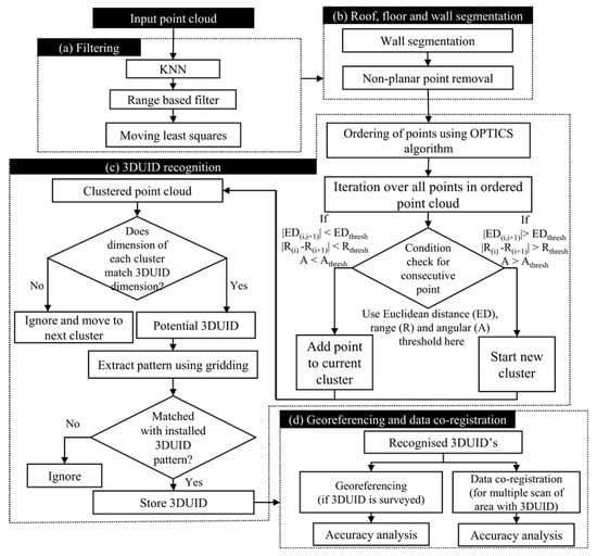 Stages of 3DReG workflow to facilitate automated georeferencing and data coregistration. (a) Filtering of point cloud data to remove erroneous and uncertain points, (b) segmentation of roof, floor and wall to reduce the processing time for 3DUID recognition, (c) processing workflow for 3DUID recognition using ordered point cloud obtained from OPTICS algorithm, and (d) georeferencing using surveyed 3DUID and multiple point cloud coregistration through 3DUID correspondence.