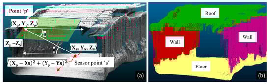 (a) Angle projected at a point between the nearest sensor location and the XY plane (shown with green shaded area). Whenever this angle was less than the specified threshold value, the point was stored. The process quickly segments the wall which may contain potential 3DUID. (b) The segmented roof, floor and walls shown with different colours for better visualisation.