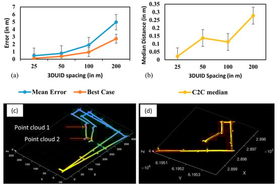 The georeferencing of sections with different 3DUID spacing was analysed with a LOOCV approach for each section. The mean and best case results obtained for various subsections are shown in Figure 8a. The MAE represents the average of absolute errors achieved after evaluating five different combinations according to LOOCV analysis for five 3DUIDs (see Figure 3f). A measure of best case absolute error was also provided to represent the most accurate georeferencing amongst the five possible combinations. A systematic increase in error was observed with an increase in spacing between 3DUID tags with a substantial increase beyond 100 m spacing (Figure 8a). To further evaluate the georeferencing accuracy, a median of C2C distances between the two georeferenced datasets for subsections with different 3DUID spacing was computed. The C2C distance increased gradually with minor variations between 25 m and 100 m spacing levels, and followed a sharp increase beyond 100 m (Figure 8b). Table 1 reflects quantitative estimates of errors for various spacings levels between 3DUIDs. The MAE in georeferencing was within 1.89 m using LOOCV while the best case error was within 1 m when 3DUIDs were installed at a distance of 100 m or less. Since spacing becomes nonuniform in LOOCV when one of the tags is omitted, the error increases. An error of <1.89 m can be expected when 3DUIDs are spaced uniformly. The georeferencing error showed increment with 3DUID spacing and exceeded 2 m for 200 m spacing. Based on these results, nine 3DUID tags installed at 100 m apart were used for final georeferencing of the entire 850 m point cloud scan. The MAE between the surveyed coordinates and the transformed point cloud coordinates was 1.76 m. The last 3DUID exhibited the highest error in the georeferenced coordinate, the absolute deviation was 1.83 m along x-axis, 0.82 m along y-axis and 0.014 m along z-axis. This could be due to the error accumulated in total station survey which increases with survey distance along the lengthwise direction of the tunnel i.e., the x-axis. The two point clouds in their independent local coordinate system are shown in Figure 8c, while the two point clouds after georeferencing using 3DReG are shown in Figure 8d. The median of C2C distances between the two point clouds after georeferencing was 0.5 m indicating a good match between the two point cloud scans.