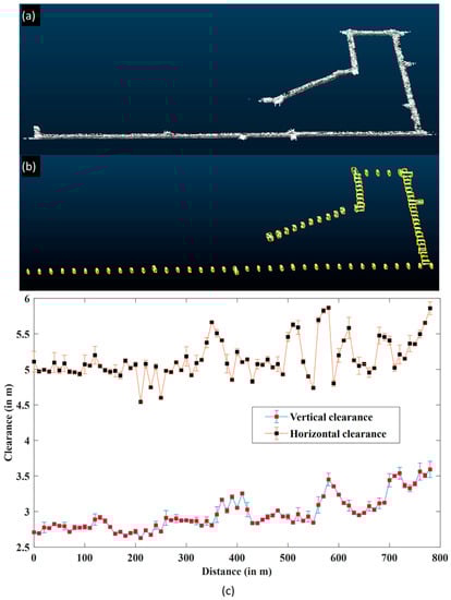An assessment of consistency between cross-sectional profile extracted automatically from point cloud using 3DUID and in situ ground truth measurement was performed. This was primarily to ascertain the efficacy of extracting reliable cross-sectional profiles using point cloud scans, which is often a compliance and operational requirement for mitigating roadways collision hazards to moving vehicles or mine personnel and measuring convergence or floor heave rate. The cross-sectional profile obtained from the point cloud was validated by comparing vertical and horizontal clearance between the first and the last 3DUID against the field measurements collected using a laser distometer at every 10 m. The point cloud and extracted cross-sections at 10 m spacing are shown in Figure 10a,b, respectively. The values of vertical and horizontal clearance along with error observed in measurement from a point cloud, represented with corresponding profile and error bar plots at each measurement point, are shown in Figure 10c. The blue plot with red dotted points denotes vertical clearance while the orange plot with black dotted points indicates horizontal clearance. The horizontal clearance is usually more than the vertical clearance to allow passage of incoming and ongoing vehicles without impedance. When summarised, the point cloud exhibited a root mean square error of 0.048 m and 0.065 m in vertical and horizontal clearance, respectively. The minimum and maximum errors in the measurement of vertical clearance from the point cloud were 0.001 m and 0.120 m, while in horizontal clearance they were 0.001 m and 0.150 m, respectively.