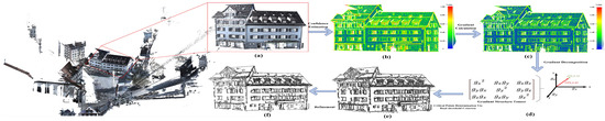 Figure 1. Pipeline of the proposed methodology. (a) The representative building is selected by the manual segmentation. (b) The visualization of confidence measure of building point clouds. (c) Gradient visualization of building point clouds. (d) Gradient structure tensor encoding. (e) The critical point clouds extraction via dual-threshold criterion. (f) The refinement of critical point clouds through simplification. - Gradient structure tensor encoding: We encode each point’s structure tensor, which describes the gradient variation in the local neighborhood areas. Through analyzing each point’s structure tensor, building point clouds can be roughly labeled into corner points, edge points, boundary points, and constant points (see Section 2.3).