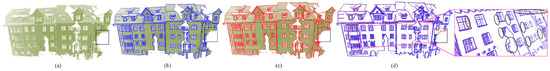 We compare the proposed algorithm with two other classic algorithms, including Canny edge detector [33] and Xia’s method [36]. As the Canny edge detector is designed for 2D images rather than 3D point clouds, we project the building façades onto 2D gray images according to the dominant façade’s normal and location. The value of each pixel is an average gradient value of all point clouds within each pixel. The pixel value is normalized to the range from 0 to 255. Compared with the Canny edge detector that worked on raster images, Xia’s and our methods are implemented onto 3D point clouds. The comparison results with these two methods are shown in Figure 10. We can see that our method can effectively extract the critical points from façades with a high degree of complex shapes. In Semantic3D Building 3, the enlarged rectangles denoted by the purple color have a very complex geometric shape with a high degree of nonlinear structure. Despite this, we can obtain a reasonable skeleton for this complex shape; however, some edge points are missing in Xia’s result. As our method works directly on the 3D point clouds like Xia’s method, this means these two methods can effectively maintain the geometric shapes of building façades without artifacts; however, for the Canny method, it inevitably brings distortions during the conversion from 3D point clouds to 2D grayscale images. This is demonstrated in Building 5 denoted by red rectangles. In addition, it should be noted that the Canny detector often produces an adverse effect of “double edge”, which means one edge is represented by two contours due to the thickness/width of the edge, as evident in blue rectangles in Semantic3D Building 5. We should also notice that our method is also insensitive to the density of point clouds. In the enlarged areas of green rectangles in Semantic3D Building 7, the point cloud is extremely sparse and with irregular distribution. In this case, Canny and Xia’s results are very messy; however, our method is superior to these two methods because of the reasonable definition of 3D gradient and an accurate analysis of the gradient structure tensor.