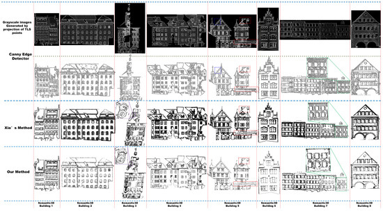 Comparison with classic Canny edge detector [33] and Xia’s method [36] on eight representative buildings in the Semantic3D dataset. The first two rows represent results derived from the Canny edge detector. The grayscale images in the first row generated by projection of Semantic3D TLS point clouds are provided as inputs to the Canny edge detector. Xia’s results are presented in the middle row, and our results are given in the bottom row.