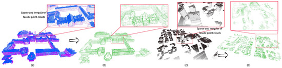 The UAV-based photogrammetric point cloud is used to test the algorithm’s applicability for processing data captured from the consumer-grade UAV DJI Phantom 4 RTK. The density of UAV-based point clouds is restricted to the resolution of the acquired images. The obtained point clouds are calculated by stereo-image matching rather than directly surveying using the LiDAR technique. Because of this, the photogrammetric point clouds miss fine details and sharp edges with massive artifacts, as demonstrated in the enlarged views in Figure 6. Despite this, the proposed algorithm has the capability to abstract the building façade contours.
