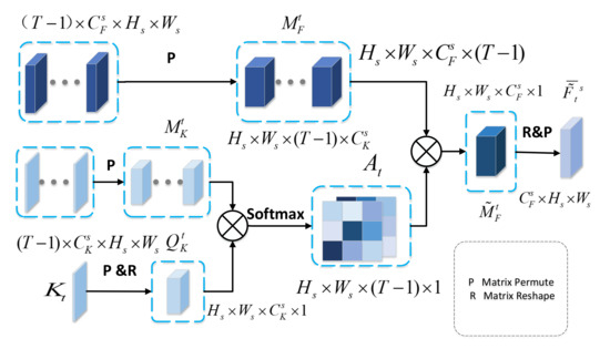 As depicted in Figure 4, we concatenate the feature maps and key features of other temporal SAR images along the temporal dimension generating a 4-dimension matrix, and permute them to and , respectively. We permute and reshape the key feature of SAR image to . Next, we multiply and , and then apply a softmax layer to calculate the temporal attention map . Especially, is the degree of correlation between key feature and and is given as: