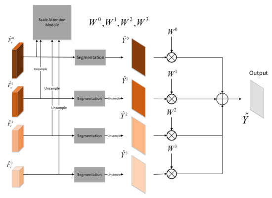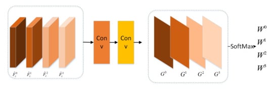 As shown in Figure 6, the scale attention module feds with the multiscale feature maps . We upsample , and , so that these feature maps have the same width and height with the feature map . As shown in Figure 6, the multiscale feature maps are input to the scale attention module to learn the weights corresponding to each scale . The scale attention module is composed of . The weight is computed by the Equation (3).