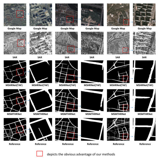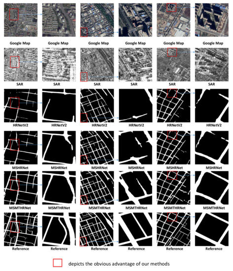 We present quantitative comparisons in Table 2. According to Table 2, MSHRNet outperforms the HRNetV2, this is due to the modified MSFM. By adding TCEM, our proposed MSMTHRNet achieves better performance than MSMTHRNet(TAF). The reason is that the TCEM can capture long range temporal contextual information to obtain enhanced representation. The differences are greater when using the metric specifically designed to gauge the quality of road network reconstruction. For pixel-based metric IoU, MSHRNet and MSMTHRNet improve over the HRNetV2 by up to and , and MSMTHRNet improve over the MSHRNet (TAF) by up to . Form the Table 2, we can discover that the MSMTHRNet improves the APLS by and over the HRNetV2 and MSHRNet(TAF) respectively, which reveals that our proposed method can improve road connectivity. For topology-based metric TOSM, our proposed method greatly improves the correctness of road topology and decrease the number of infeasible paths that indicates missing links.