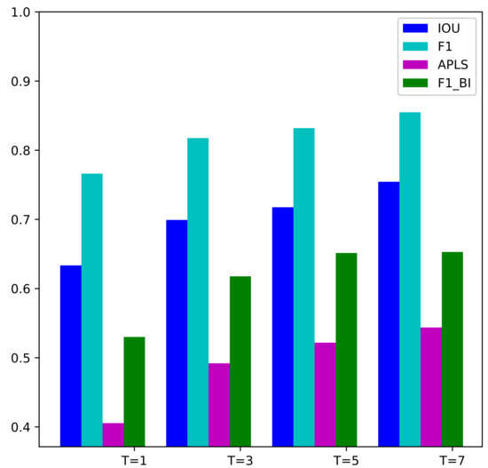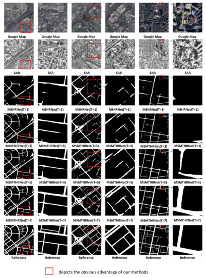 In this section, we will discuss how the number of input SAR images affects the performance of our proposed method. We evaluate the MSHRNet whose input is a single SAR image, the MSMTHRNet () with three input SAR images, the MSMTHRNet () with five input SAR images and the MSMTHRNet () with seven input SAR images on the test samples in the test set. The quantitative comparisons are summarized in Table 3 and Figure 10. And the qualitative comparisons are illustrated in Figure 11. Form Table 3 and Figure 10, we can see that by increasing the number of input SAR images, the performance of road detection continuously improved. From the pixel-wise perspective, MSMTHRNet (), MSMTHRNet (), MSMTHRNet () are , and higher than the MSHRNet, respectively, in the IoU metric. From the topology-wise perspective, MSMTHRNet (), MSMTHRNet (), and MSMTHRNet () are , , and higher than the MSHRNet, respectively in the APLS metric, which reveals that the connectivity of road is enhanced continuously by increasing the input SAR images. As shown in Figure 11, increasing input SAR images makes the missing road regions consistently decrease and road detection results have better road connectivity. The reason is that the more SAR images input, the better the temporal consistency of the enhanced feature representation obtained through the temporal consistency enhancement module, which can reduce the affects of occlusion, coherent spots, and shadows.
