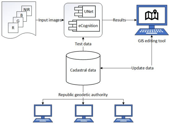 The Republic Geodetic Authority (RGA) in Serbia is a government organization responsible for professional and public administration related to state survey, real estate cadastre, utility cadastre, topographic-cartographic activities, property valuation, and geodetic-cadastral. This organization is also responsible for the legal framework related to survey and cadastre. As part of this legal framework, the rulebook on records on determined changes on buildings was adopted in 2020 [22]. This rulebook defines the content, development, maintenance and use of the register about the determined changes on buildings based on satellite imagery. For this purpose, RGA conducted the acquisition of the VHR satellite imagery data for the entire country. The register will be built for the entire territory of the Republic of Serbia and will be part of the geodetic-cadastral information system (GCIS). The register should contain data about detected changes on objects in relation to the reference era of aerial or satellite photography. These changes include data about buildings that are not recorded in the real estate cadastre, and buildings that are recorded in GCIS, but are removed from the field or changed in terms of dimensions of the footprint recorded in the database. The register contains graphical and alphanumerical parts, i.e., geospatial data about footprints of the buildings, and attribute data that describe particular buildings (such as, unique identification number, building area, type of change, etc.)