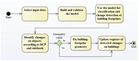 The overview of the basic steps of the proposed methodology is shown in Figure 3. The first step after the pre-processing and validation of the proposed model is a detection of the building’s footprint using satellite images with a high spatial resolution. After detection of the building’s footprint and identification of changes on objects according to the rulebook and digital cadastral plan (DCP), it is necessary to check if the geometry of a detected object is valid, and to fix it if it is not. This step is manual, which means that for each detection it is necessary to validate geometry using an editing tool. After the validation, the final step is to update the cadastral database. All steps will be explained in detail.