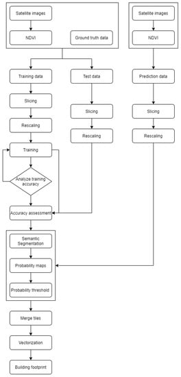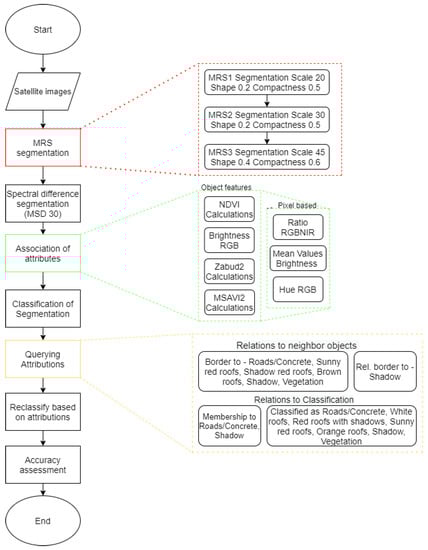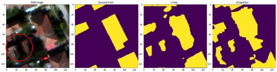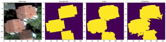 The building footprint detection used in the study included two proposed methods. The first one used OBIA methods developed using eCognition, shown in Figure 4, while the pixel-based classification was carried out using U-Net.