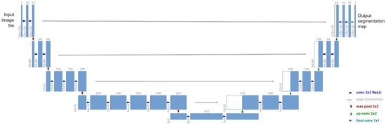 The decoder and encoder contain four blocks. Each decoder block consists of a re-sampling operation followed by a 2 × 2 convolution that halves the number of channels, which is combined with the corresponding encoder map. Each decoder block has two convolutional layers with a 3 × 3 filter and a ReLU activation function applied to each of them. The last layer of the grid connects each pixel with a certain class and performs a convolution operation with a 1 × 1 filter. Finally, we can say that the network architecture applied in this paper has 23 convolutional layers, and 21 ReLU activation functions.