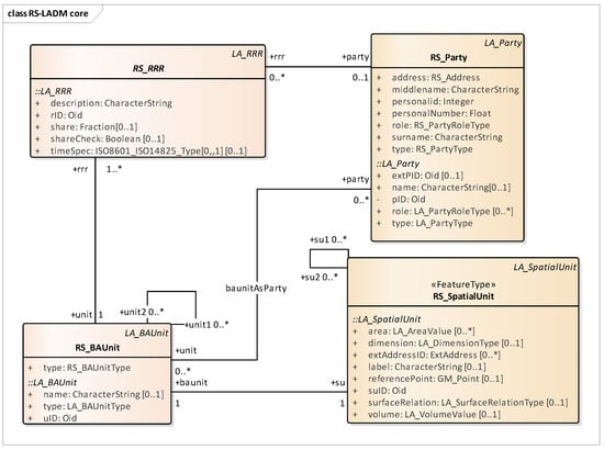 The rulebook defines the new records as an extension of real estate cadastre records. Therefore, it is necessary to define a data model for the determined changes on the buildings. A well-defined data model is the core of the cadastral information system. Thus, it must be in accordance with existing international standards as well as with national legislation. A conceptual data model for real estate cadastre in Serbia [43] was developed according to the Law on State Survey and Cadastre [44] and ISO 19152 Land Administration Domain Model [45]. A conceptual data model (UML Class diagram) for Serbian cadastre is based on four classes that represent main concepts of real estate cadastre as shown on Figure 7: parties (RS_Party), spatial units such as parcels, buildings and building parts (flats, business offices) (RS_SpatialUnit), rights and restrictions that parties can have over spatial units (RS_RRR) and basic administrative units that collect all the data regarding one spatial unit (RS_BAUnit).