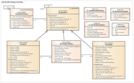 This core model is further developed in detail to introduce all necessary classes and associations between them to fully represent the standardized cadastral domain for Serbia [43]. In order to extend this model to contain new records on changed buildings, a new class RS_Changed_Building was added (Figure 8).