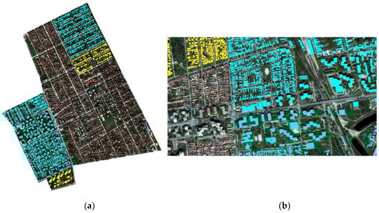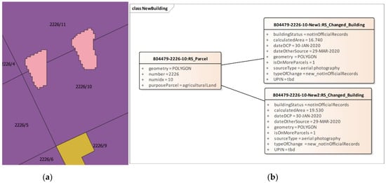 (a) Purple—parcels in the official records, yellow—buildings in the official records, pink—detected buildings. (b) An instance diagram of detected new buildings.