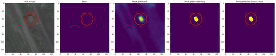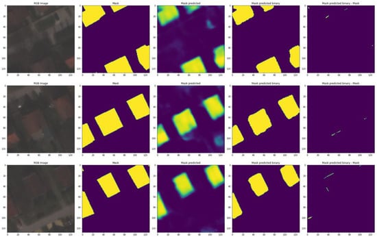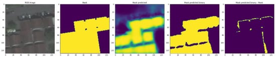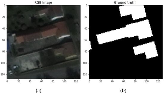 In the next phase, inaccuracies in the vector data were corrected, and then that data were converted to raster format. In this way, binary rasters were obtained where pixels with a value of 1 represent the locations where the object is located, while pixels with a value of 0 represent locations where there are no objects. The raster obtained in this way, together with satellite image, will represent the input data for the training of the U-Net neural network (Figure 10).