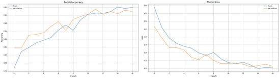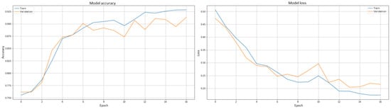 After the data were prepared in an appropriate way, the neural network architecture was chosen and the model for classification was created, the training of that model and the assessment of its accuracy could begin. The input data set for training was divided into two parts with a ratio of 80:20. With this step, we could conduct a quantitative assessment of the model during the training of the neural network, and we could obtain information about how well the network is trained with data that did not participate in the training. To avoid excessive network training, which can lead to poor identification of objects, the early stop parameter in the training phase was used. With this parameter, the training was interrupted at the moment when the accuracy rating over the validation data starts to decrease (if better results are not obtained in the next three epochs from the moment the highest accuracy is reached).