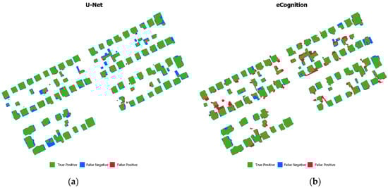 In the initial phase of data collection and analysis, a large amount of data on buildings were collected; this set contains over 1500 polygons which represent the position and shape of each object. Of the total amount of data on buildings, for classification in eCognition and U-net, about 80% was taken for model training while the remaining 20% was used for model testing to assess accuracy (Figure 9).