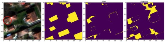 The following examples (Figure 25) also show a comparison of the two classification models, where we can see that both methods successfully recognized the upgrade of one object. In this example as well as in the previous one, we see that the best results (with the least number of misclassified pixels) are achieved using the proposed architecture of the U-Net neural network.