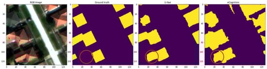 A problem that can occur when comparing the data obtained from the cadastre and the data obtained during the identification of buildings is the identification of a slightly wider zone around the building and the assignment to the same class of buildings. The reason for the appearance of this “buffer” is often the acquisition angle, which can make it difficult to separate the roof from the side walls of the object. U-Net neural network architecture can solve this problem, by reducing the probability limit. The following figure (Figure 26) gives an example of this problem for all classification methods. This problem, which is especially pronounced in tall buildings, leads to incorrect identification of objects, i.e., an object with a larger area than the actual area of the object in cadastral records; moreover, spatial position of the identified object will be shifted in relation to the building (the position of the object will differ from the cadastre).
