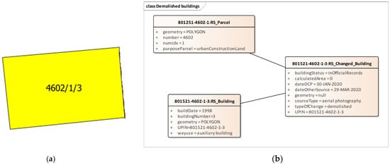 The first case is a situation when the detected data show that the building is demolished. A building 4602/1/3 is stored in the official records. The proposed method showed that there is no building on that location anymore. Since the date of satellite acquisition is later than the validity date in the official records, it can be concluded that the building has been demolished in the meantime. An instance diagram and building in the official records that represent such situation in Subotica are presented on Figure 28.