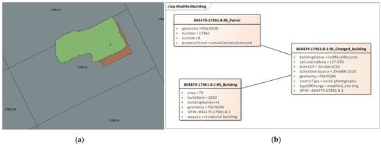 (a) Blue—parcels in the official records, red—buildings in the official records, green—detected buildings. (b) An instance diagram of detected change on the building.