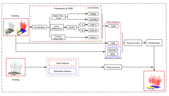 Therefore, we propose a voxel-based local binary pattern feature, that is, the VLBP feature. In addition, to achieve the effective classification of point cloud data with color information, we propose a point cloud classification algorithm based on the fusion of voxel local binary pattern features and geometric structure features in which the random forest classifier with an excellent classification performance is selected. The process of the proposed classification algorithm is shown in Figure 1.