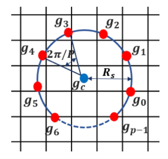 P-nearest neighbors evenly spaced from the center pixel and circle of radius Rs.