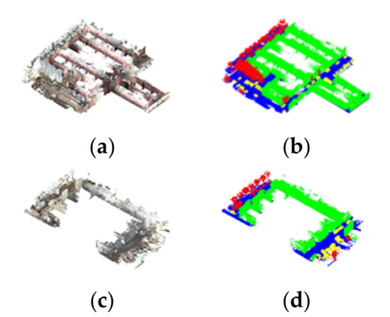 Scene 3 point cloud data. (a) Original point cloud of the training set; (b) ground truth of the training set; (c) original point cloud of the test set; and (d) ground truth of the test set. Red, green, yellow, and blue points represent trees, cars, buildings, and floors, respectively.