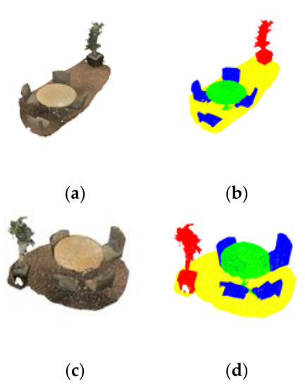 Scene 5 point cloud data. (a) Original point cloud of the training set; (b) ground truth of the training set; (c) original point cloud of the test set; and (d) ground truth of the test set. Red, green, yellow, and blue points represent plants, tables, floors, and chairs, respectively.
