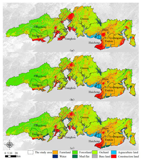 In the regular growth scenario, farmland was mainly distributed in Yinhai District, Tieshangang District and the southern of Hepu County (Figure 4a). Forestland was mainly located in the Fangcheng District, Dongxing District and the western of Qinnan District, while orchard was mainly distributed in the Qinnan District, Gangkou District and the northwestern and eastern of Hepu County. Construction land was distributed within the eight districts and counties in a zoned aggregation, and aquaculture land was mainly located in coastal areas such as Hepu Country and Yinhai District. The water bodies were mainly located in the southern of the Beibu Gulf area and had a small area. There were also two large lakes in Hepu County. The mud flat was mainly located on the seashore, while the bare land was sporadically distributed within each district and county.