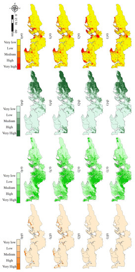 In 2014, forestland was mainly concentrated in Fangcheng District and Dongxing District (Figure 5b). In contrast, the distribution of forestland under the three scenarios was consistent with that of 2014, but some districts or counties have significant changes in the clustering of it. The clustering of forestland within Dongxing District and Hepu County in the regular growth scenario was significantly weakened, while that of forestland within each district and county in the ecological protection scenario was significantly enhanced. The clustering of forestland in the ecotourism development scenario was consistent with 2014.