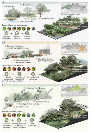 Landscape planning for different local economic development models of the study area. (a) featured forest and fruit economy, (b) special agricultural products, and (c) featured under-forest economy.