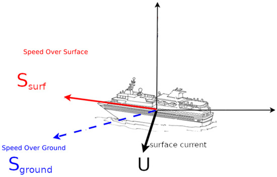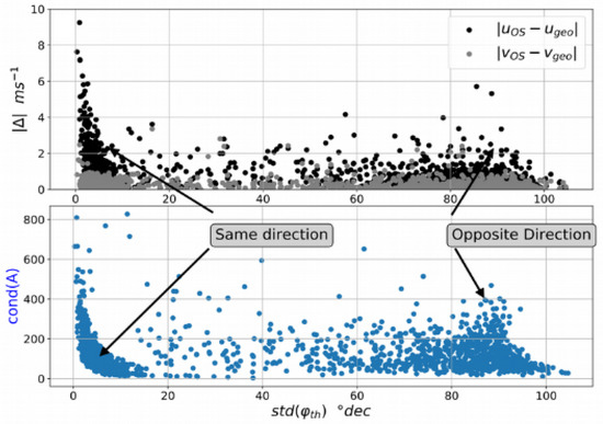 where denotes the sea surface current at a given ship location p at time t, refers to the speed over ground, to the surface speed of the boat, a vector pointing towards the known heading direction of the ship. With a single observation we cannot invert the linear system described by Equation (1). However, assuming that sea surface current conditions evolve slowly in space and time and that the density of ships is large enough, we may derive a least-square solution as explored in [14]. The performance of this approach is however highly dependent of the conditioning of the linear system as shown in Figure 2, which may impede the relevance of the estimated sea surface conditions. To address this issue, we propose to combine this observation model with a learning-based variational formulation as introduced in the next section.