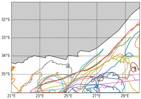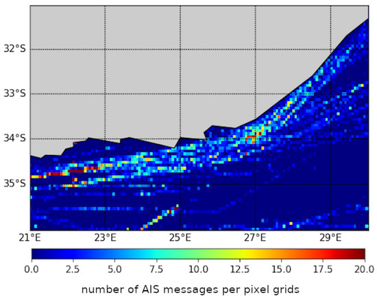 Example of daily coverage of the AIS data available on a daily basis: here 16 January 2016, for the considered case-study area, off South Africa.
