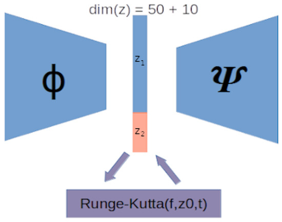 We consider a neural implementation of the dynamical system stated in Equation (5). More specifically, we exploit a neural ODE package [29,30] with a fourth-order Runge–Kutta (RK4) integration scheme.