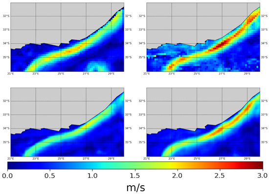 We provide an illustration of the reconstructed velocity fields on 16 January 2016 in Figure 6. The sea surface current estimated by VAE-NODE-AIS+GLORYS depicts information at fine scales (e.g., the width of the current coming from the north-east of the area) and sharp gradients compared with the altimeter-derived AVISO method. Whereas the AIS-OI baseline involves local artifacts, which relate to noise patterns of the AIS dataset and local outliers for simplified observation model (1), the proposed framework retrieves more consistent space–time dynamics. This is regarded as a direct outcome of the considered regularization through the proposed latent ODE representation. When using both AIS and GLORYS data in the training phase, we retrieve much larger velocity values along the high-current area. As the VAE-NODE-AIS and VAE-NODE-AIS+GLORYS configurations reach similar values for training loss J, this suggests that the additional use of GLORYS data greatly improves the interpolation capabilities of the trainable latent ODE representation.