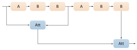 Illustration of the multiple receptive field feature integration. A and B represent two different types of residual modules, respectively, while Att represents the attention-based feature fusion.