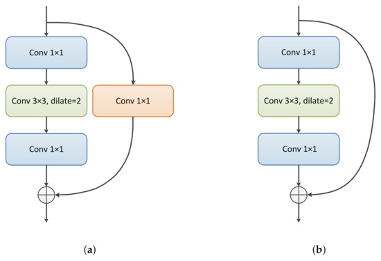 Illustration of the residual blocks in multiple receptive field feature integration. (a) Structure A with convolutional mapping. (b) Structure B with identity mapping.