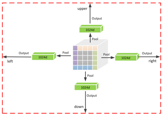 Specifically, as shown in Figure 6, the boundary regression module takes a size feature map produced by the ROI Align [10] layer for each proposal as input. Then, since the convolution operation applies shared transformations which are more robust to regress the ship boundary, the number of channels is increased through two convolution branches to obtain a size feature map. Finally, four 1024-d vectors are obtained via the extreme point pooling to regress the offset of the proposal, respectively. The structure of extreme point pooling is shown in Figure 7. Features of the outermost circle are first divided into four parts, which are upper, lower, left and right (identified by different colors). Then, max pooling is performed to convert these four parts of features into 1024-d vectors, each of which is responsible for regressing the corresponding offset.