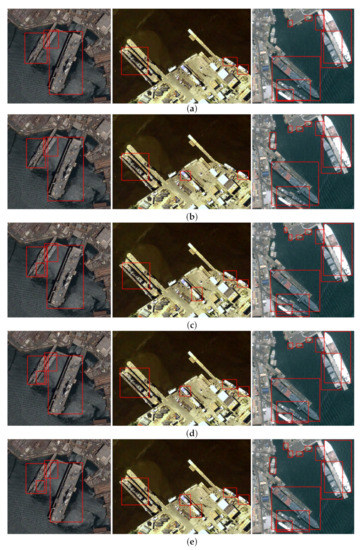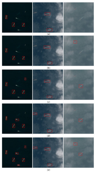 Comparison of the ship-detection results by different methods on the HRSC2016 dataset. (a) Faster R-CNN [5]. (b) RetinaNet [8]. (c) YOLOv3 [9]. (d) Mask R-CNN [10]. (e) Our method.