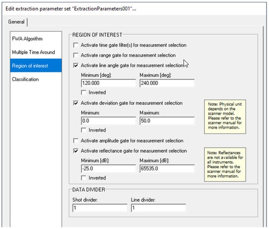 The VUX-1UAV sensor is capable of collecting these types of data: (i) laser data generated by LiDAR; (ii) trajectory data generated by the IMU/GNSS unit, and (iii) images taken by RGB cameras. As we designed our algorithm to be universally applicable to process LiDAR data, RGB images were not collected for this study. The workflow of the data processing is depicted in Figure 1. The first step which has to be performed is to calculate the precise trajectory. The trajectory data are collected by Applanix APX-20 (Trimble Inc., Sunnyvale, CA, USA). IMU/GNSS provides direct georeferencing of airborne sensor data. To increase the precision of the trajectory, the data are further processed with the POSPac UAV software (Trimble Inc., Sunnyvale, CA, USA). The data processing requires correction of the data in RINEX format. Our own GNSS reference station with a RINEX 2.11 format was used. The total RMS error in elevation is below 2 cm. All the other steps of the laser data processing were performed with the RiPROCESS software (RIEGL GmbH, Horn, Austria). Proper settings of “Extraction parameters” include three types of parameters: (i) line angle gate for measurement selection; (ii) deviation gate, and (iii) reflectance gate. All three parameters significantly influence the results. The actual settings are shown in Figure 2.